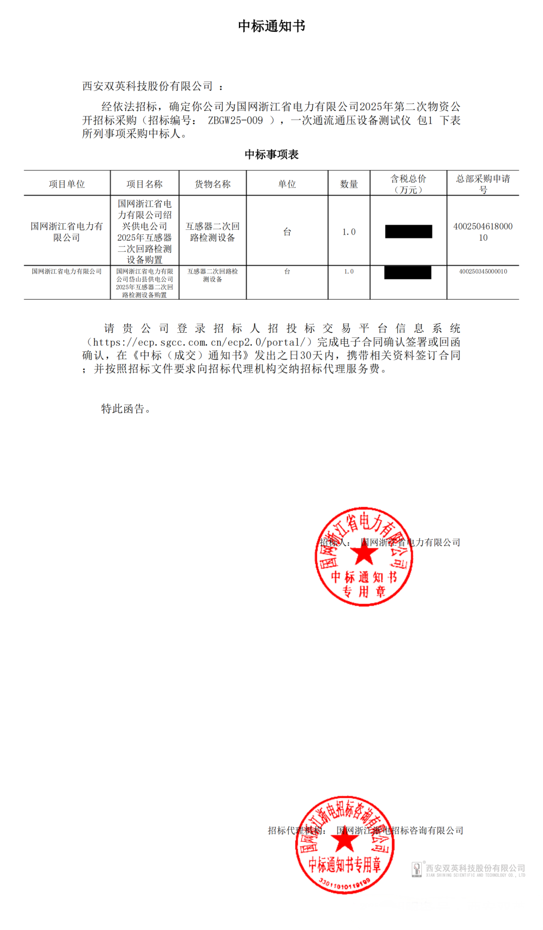 西安雙英科技股份有限公司在國網浙江省電力有限公司2025年第二次物資公開招標采購項目中標用電檢查綜合測試儀和一次通流通壓設備測試儀。